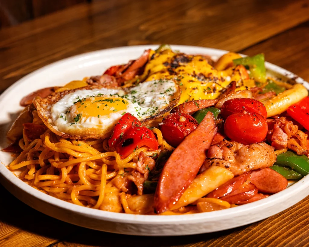 A Japanese-style ketchup pasta stir-fried with bacon, rice cakes, onions, and bell peppers for a sweet and savory comfort dish.