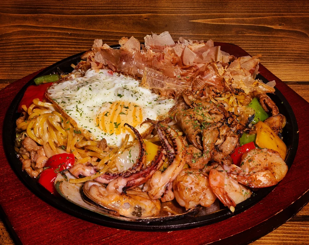 Stir-fried noodles with pork, seafood, and vegetables, topped with dried fish flakes.