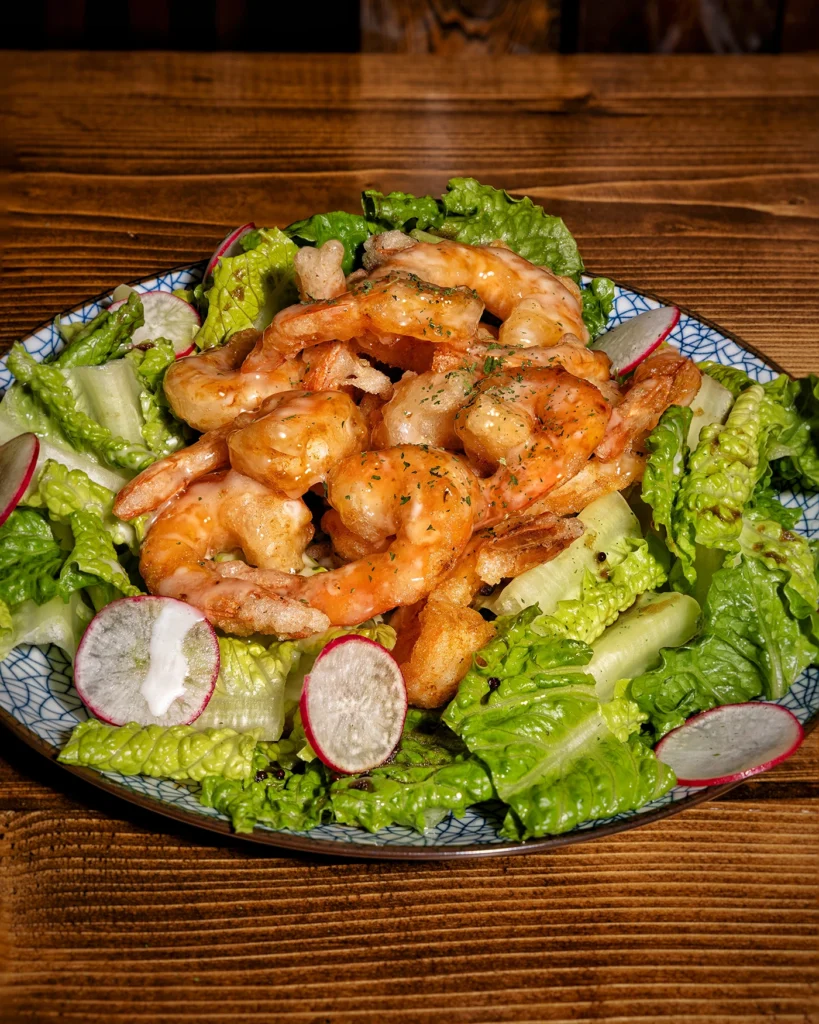 Crispy fried shrimp topped with creamy yuzu mayo, served with fresh iceberg salad.